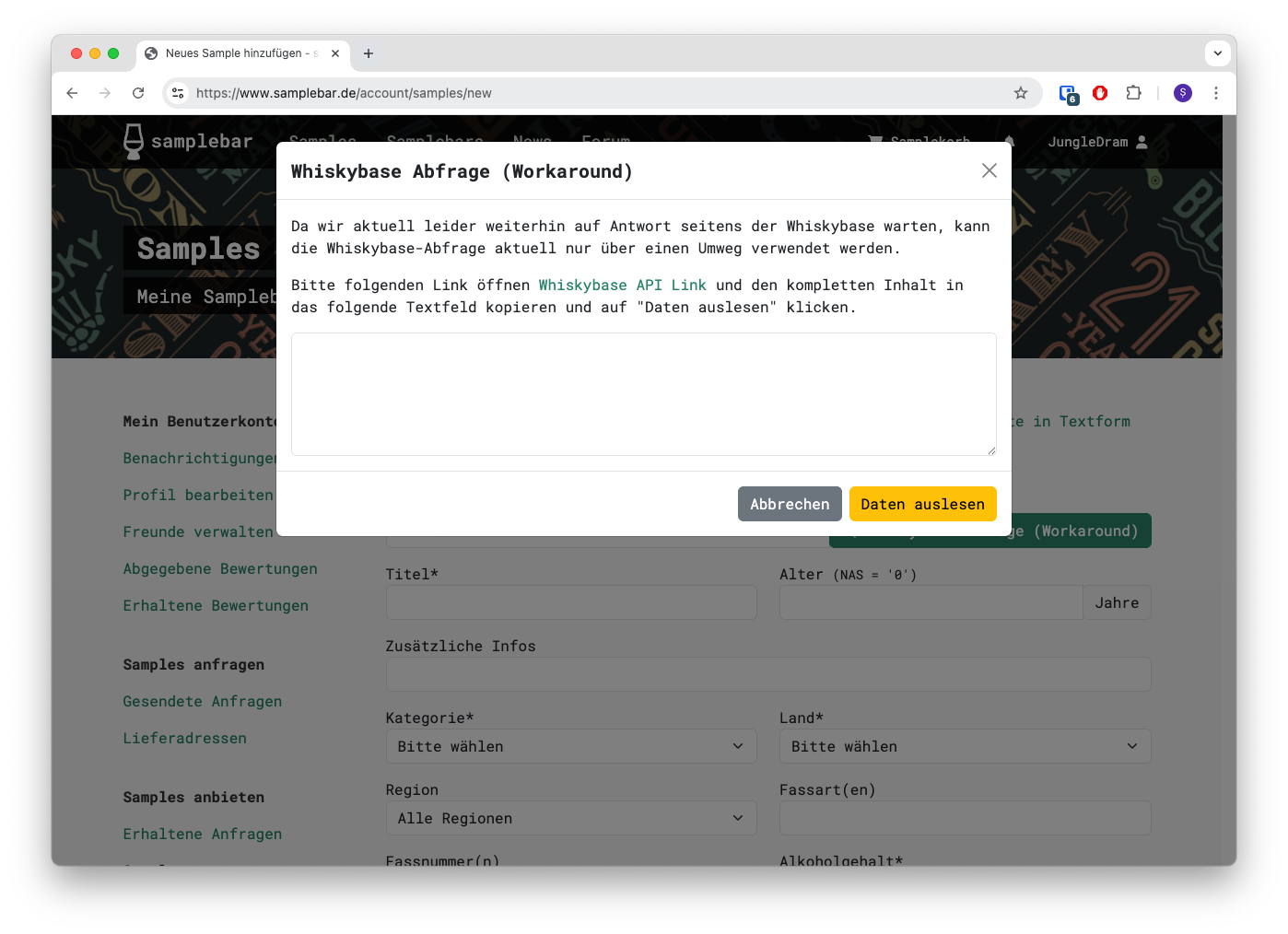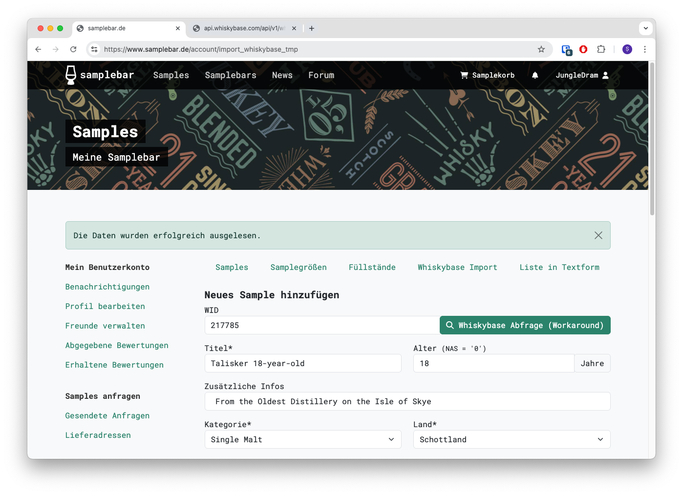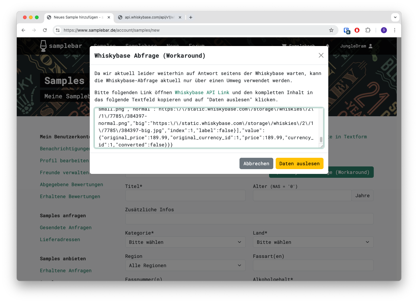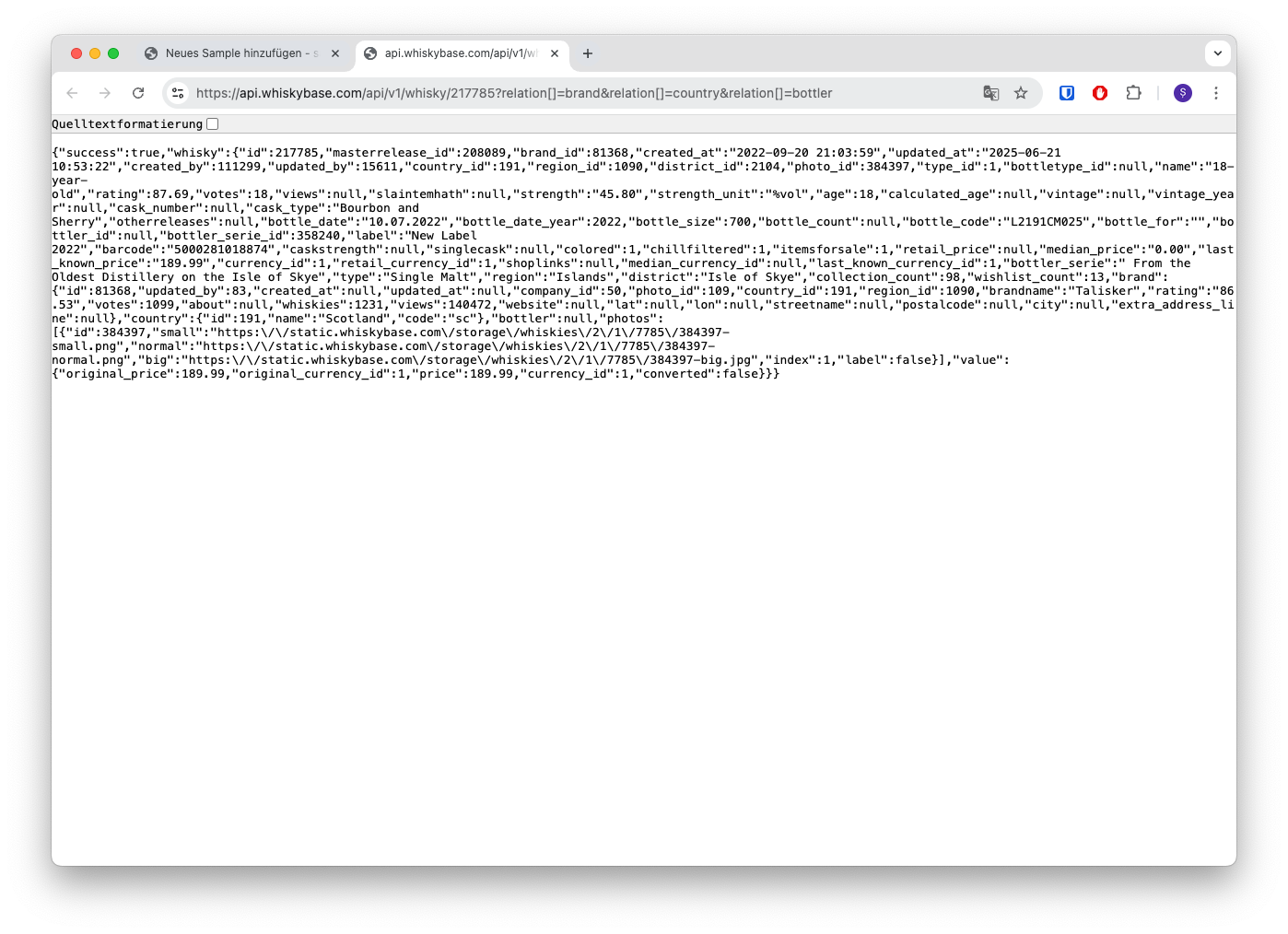 Wenn ihr diesen Link klickt, öffnen sich die Rohdaten der Whiskybase Schnittstelle in einem neuen Tab. Diese Rohdaten müsst ihr einfach (vollständig) in das Feld im Kasten auf der Samplebar-Seite kopieren.